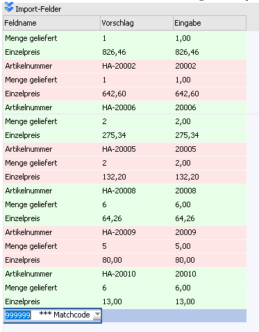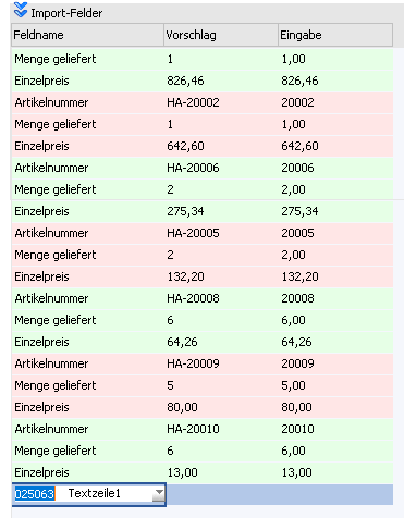 Die hier aufgeführte Meldung hebt hervor, dass sich in den beiden vorhandenen Blöcken der Belegmitte Artikelnummern befinden, bei denen es kein Match hinsichtlich der eingepflegten Lieferantenartikelnummern gibt.