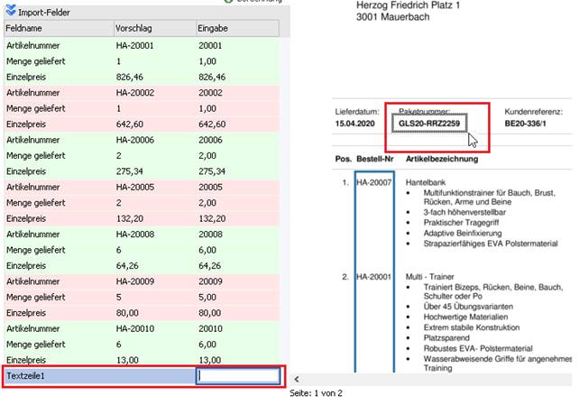 Hier können die erkannten Felder bearbeitet werden, indem man sich in das Feld innerhalb der Spalte "Eingabe" stellt. Es ist ebenso möglich, Werte aus der Vorschau mittels "Bestreichung" zu übernehmen.
