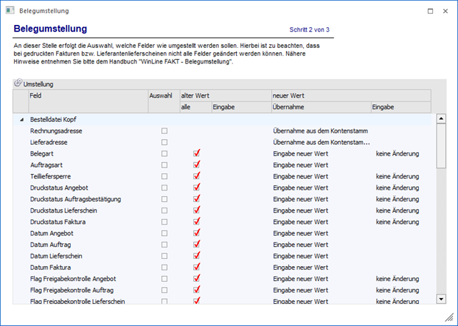 In dem zweiten Bereich der Belegumstellung wird die eigentliche Umstellung definiert, d.h. was soll wie geändert werden.