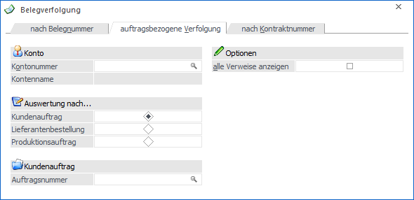 In dem Register "auftragsbezogene Verfolgung" kann die Auswertung "Auftragsverfolgung" gestartet werden. In dieser werden neben dem zu analysierenden Beleg auch alle zugehörigen Belege zu Informationszwecken aufgelistet (z.B. Lieferantenbestellungen und Produktionsaufträge zu einem Kundenauftrag).