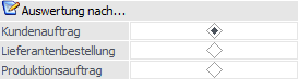 Abhängig davon aus welcher Sicht die Auswertung ausgegeben werden soll, kann in diesem Feld auf einen Kundenauftrag, eine Lieferantenbestellung oder einen Produktionsauftrag selektiert werden.