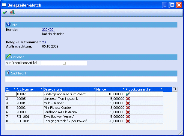 In der Tabelle wird das Suchergebnis dargestellt. Als einzelne Informationen werden hierzu die Zeilennummer aus dem Beleg, die Artikelnummer und Bezeichnung, die Menge, sowie ein Kennzeichen, ob es sich um einen Produktionsartikel handelt, angezeigt.