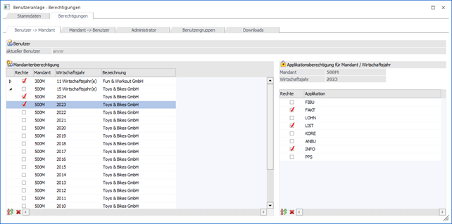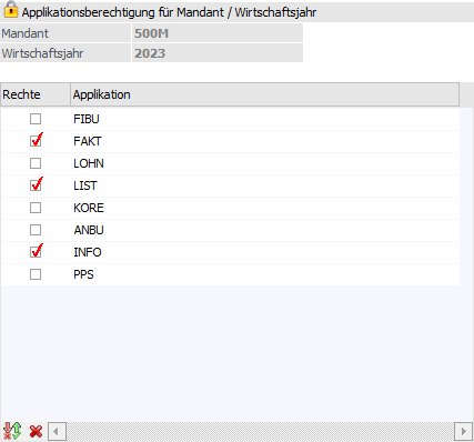 In der rechten Tabelle werden alle Applikationen angezeigt, für welche die Berechtigungen vergeben werden können, wobei hier die Berechtigungen ebenfalls pro Mandant bzw. pro Wirtschaftsjahr vergeben werden können. Über der Tabelle wird der jeweils ausgewählte Mandant (linke Tabelle) angezeigt. Wurde auch ein einzelnes Wirtschaftsjahr gewählt, wird auch diese Information angezeigt.