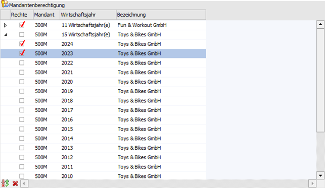 Durch Aktivieren der Checkbox wird für den Benutzer die Berechtigung erteilt, mit diesen Mandanten zu arbeiten. Die Rechte können pro Mandant bzw. auch pro Wirtschaftsjahr vergeben werden. Wird der "Haupteintrag" aktiviert, dann werden auch die dazugehörigen Wirtschaftsjahre mit aktiviert. Es kann aber auch jeder Eintrag einzeln bearbeitet werden. Z.B. kann es so eingestellt werden, dass der Benutzer zwar das aktuelle Wirtschaftsjahr bearbeiten darf, das Vorjahr soll aber nicht mehr im Zugriff sein.