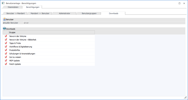 Im Unterregister "Downloads" kann festgelegt werden, welche Bereiche für den jeweiligen Benutzer in dem Fenster "Neuigkeiten" angezeigt werden sollen.