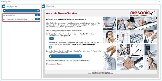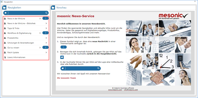 Das Fenster "Neuigkeiten" gliedert sich in die Bereiche…