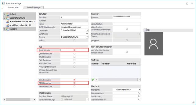 Handelt es sich bei dem Benutzer um keinen WinLine Administrator, soll aber trotzdem die Berechtigung vorliegen Bücher anzulegen und zu verwalten, so kann dem Benutzer der "DSGVO-Administrator" vergeben werden. Zusätzlich muss dieser Benutzer auch die Option "CRM Benutzer" hinterlegt haben.