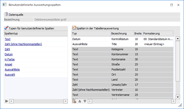 Über die Farbe der Zeile wird dargestellt, ob es sich um eine Standardspalte (graue Hinterlegung; nicht editier- oder löschbar) oder eine benutzerdefinierte Auswertungsspalte (weiße Hinterlegung; editier- und löschbar) handelt.