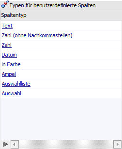 Der Spaltentyp legt fest, welche Art von Daten in einer Spalte gespeichert werden kann. Folgende Typen stehen zur Anlage von benutzerdefinierten Spalten zur Verfügung: