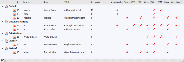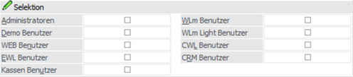 Die Spalten "Administrator" bis "Kasse" werden nur WinLine Benutzern des Typs "Administrator" oder mit der Administratorenberechtigung "Datenadministration" angezeigt.