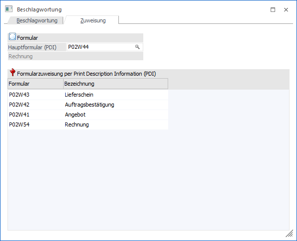 Alle Formulare eines Bereichs (z.B. Angebote oder Mahnungen) werden über das PDI (Print Description Information) zusammengefasst. Das PDI gibt hierbei u.a. vor, welche Variablen zur Verfügung stehen. D.h. es muss die Beschlagwortung nicht für die z.B. 6 unterschiedlichen Angebotsformulare definiert werden, sondern nur 1x für das Angebots-PDI.