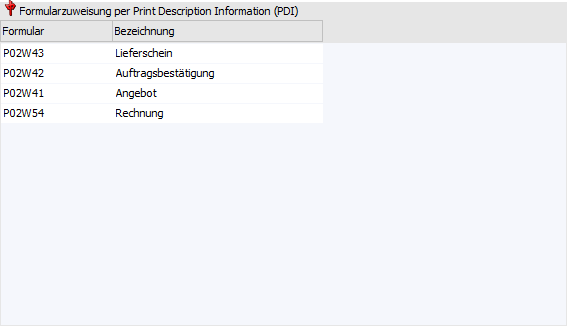 Tabelle "Formularzuweisung per Print Description Information (PDI)"