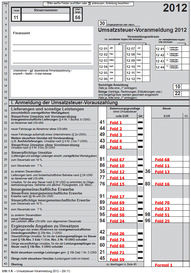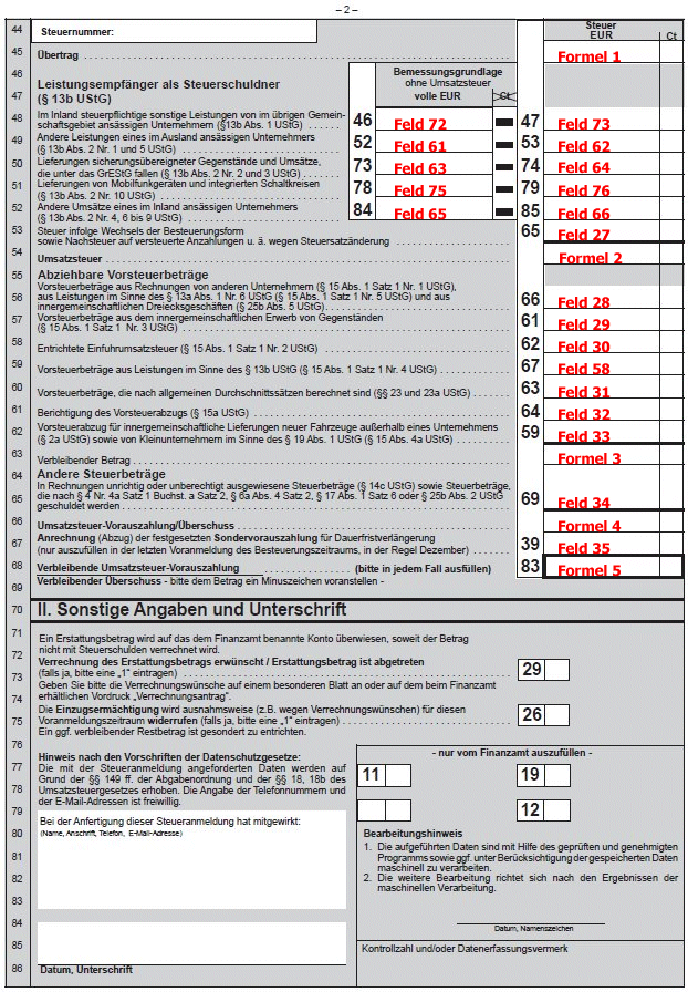 Im Folgenden finden Sie die Belegung anhand des aktuellen Umsatzsteuervoranmeldungsformulars: Für alle auszufüllenden Felder gilt eine fortlaufende Nummerierung, wobei in Zeile 20 die Position 1 gedruckt wird. Die Summe der Umsatzsteuer setzt sich zusammen aus den Positionen 68, 11, 13, 16, 70, 23, 25 und 51. Diese Summe findet sich auch als Übertrag in Zeile 45 (1. und 2. Seite).