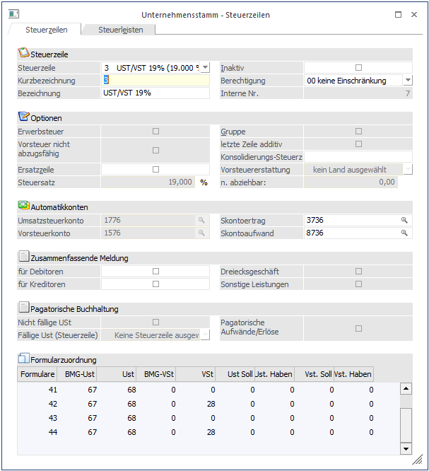 Da die Position 68 für den Übertrag benötigt wird (die Steuer wird auf Grundlage der BMG errechnet) und der Übertrag auch im Formular 44 (2. Seite) angedruckt werden muss, muss in allen Steuerzeilen (Umsatzsteuerzeilen mit 19 %) im Feld BMG-Ust die Position 67 und im Feld USt die Position 68 ebenfalls eingetragen werden.