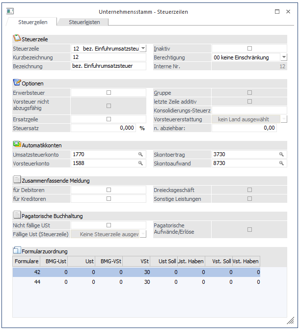 Die Einfuhrumsatzsteuer wird normalerweise, da es keine Bemessungsgrundlage und keinen Steuersatz gibt, manuell und direkt auf das jeweilige Konto gebucht werden. In diesem Fall muss dann das Feld VST Soll mit dem Formular 44 und der Feldnummer 30 gefüllt werden.