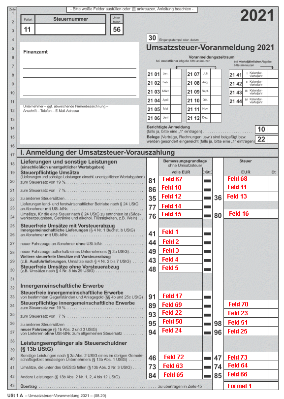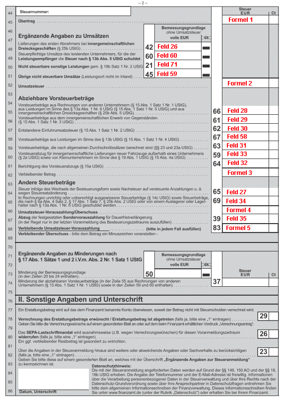 Im Folgenden finden Sie die Belegung anhand des aktuellen Umsatzsteuervoranmeldungsformulars: Für alle auszufüllenden Felder gilt eine fortlaufende Nummerierung, wobei in Zeile 20 die Position (Feldnummer) 67 und 68 gedruckt wird. Die Summe der Umsatzsteuer setzt sich zusammen aus den Positionen 68, 11, 13, 16, 70, 23, 25, 51, 73, 64 und 66. Diese Summe findet sich auch als Übertrag in Zeile 45 (2. Seite).