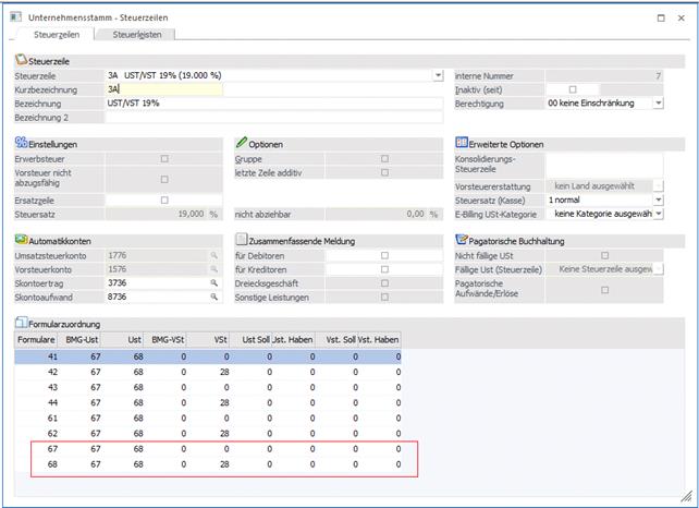 Da die Position 68 für den Übertrag benötigt wird (die Steuer wird auf Grundlage der BMG errechnet) und der Übertrag auch im Formular 68 (2. Seite) angedruckt werden muss, muss in allen Steuerzeilen (Umsatzsteuerzeilen mit 19 %) im Feld BMG-Ust die Position 67 und im Feld USt die Position 68 ebenfalls eingetragen werden.