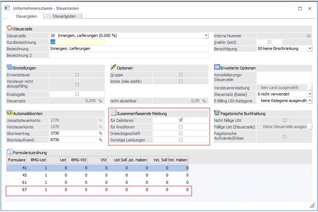 Die Position 67 enthält den Gesamtbetrag der Bemessungsgrundlagen für 19 %ige Umsätze. D. h. in der Steuerzeile muss bei den entsprechenden Zeilen (Umsatzsteuerzeilen mit 19 %) bei der BMG UST 67 eingetragen werden.