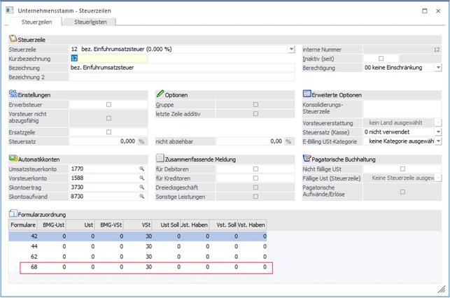 Die Einfuhrumsatzsteuer wird normalerweise, da es keine Bemessungsgrundlage und keinen Steuersatz gibt, manuell und direkt auf das jeweilige Konto gebucht. In diesem Fall muss dann das Feld VST Soll mit dem Formular 68 und der Feldnummer 30 gefüllt werden.