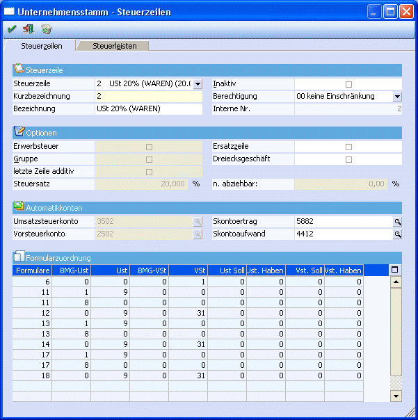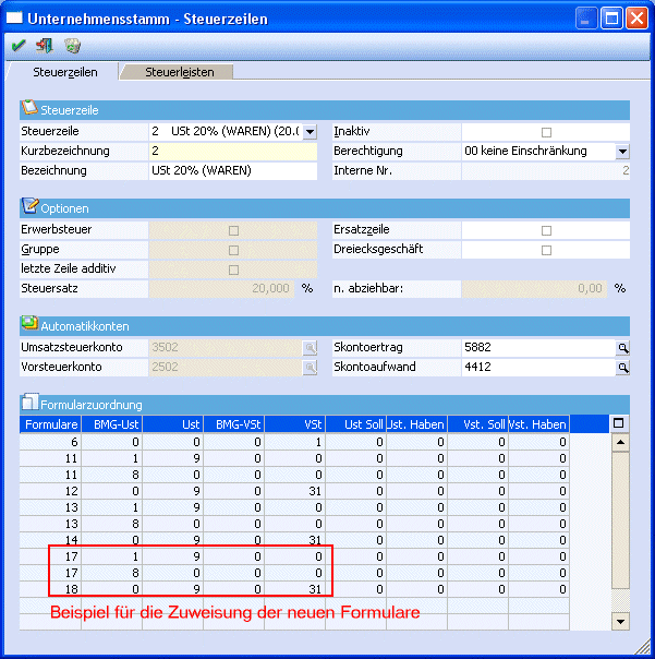 Die Position 8 enthält den Gesamtbetrag der Bemessungsgrundlagen für 20 %ige Umsätze. D. h. in der Steuerzeile muss bei den entsprechenden Zeilen (Umsatzsteuerzeilen mit 20 %) bei der BMG UST 8 eingetragen werden. Da dieses Feld aber schon mit der Position 1 belegt ist, wird eine zweite Zeile eröffnet, wo wieder das Formular 17 eingetragen wird. Dort kann die Position 8 bei der BMG UST hinterlegt werden. Pro Steuerzeile kann ein Formular auch öfters verwendet werden, so dass jede Steuerzeile an jeder beliebigen Position hinterlegt werden kann.