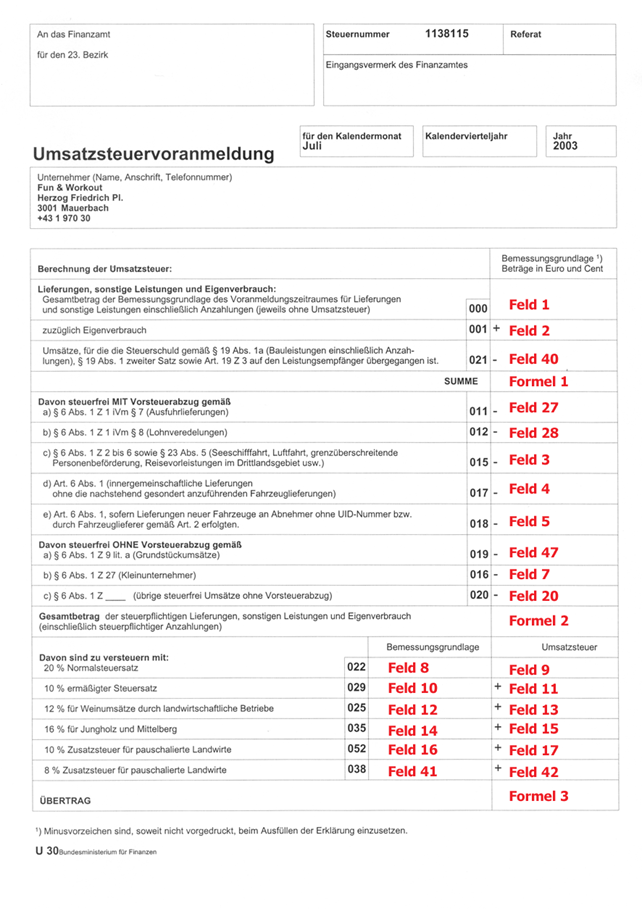 Nachdem in einigen Fällen für die Berechnung des Steuerbetrages die Bemessungsgrundlage herangezogen werden muss, und nicht die Gesamtsumme aus den gebuchten Steuerbeträge verwendet werden darf, werden nachstehend angeführte Kennzahlen am U30 daraus resultierend berechnet: