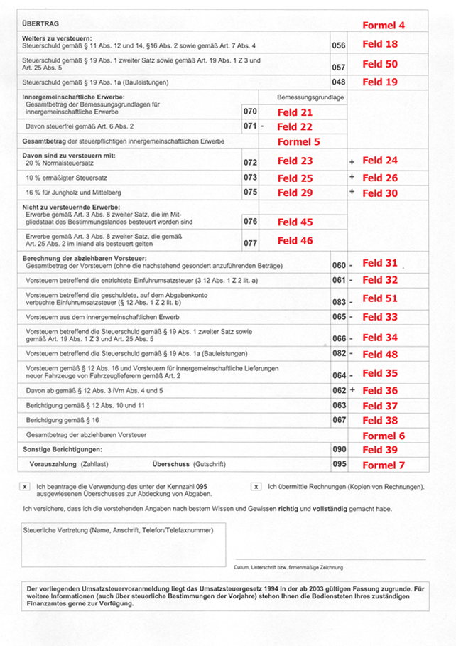 Eine detaillierte Beschreibung woraus sich die einzelnen Formeln ergeben, finden Sie nach den UVA-Formularen. Im Folgenden finden Sie die Belegung unserer Standardauslieferung: