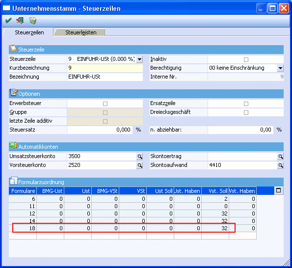 Die Einfuhrumsatzsteuer muss, da es keine Bemessungsgrundlage und keinen Steuersatz gibt, immer manuell und direkt auf das jeweilige Konto gebucht werden. Dadurch ergibt sich für den Andruck auf das Formular ein besonderer Status. In der Steuerzeile der Einfuhrumsatzsteuer muss daher das Formular 18 hinterlegt werden, im Feld VSt-Soll wird 32 eingetragen.