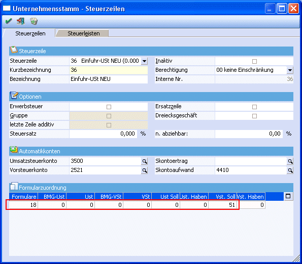 Beispiel für die Definition einer Steuerzeile zur "Einfuhrumsatzsteuer NEU" ab 10/2003