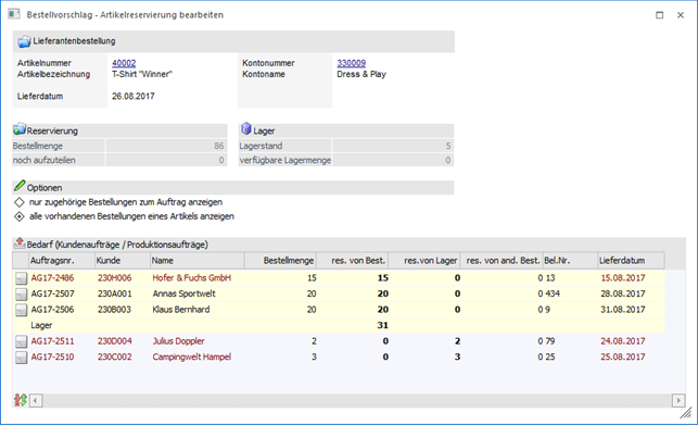 Es werden 85 Stück zum 23.08.2017 bestellt. Für die ersten Aufträge wurden bereits 55 Stück reserviert. Die restlichen 30 Stück würden auf Lager gebucht werden. Nach Aktivierung der Checkbox "alle vorhandenen Aufträge eines Artikels anzeigen" wird ersichtlich, dass noch weiterer Aufträge über insgesamt 5 Stück des Artikels vorhanden sind. Die Mengen können nun so editiert werden, dass von den übrigen 30 Stück 5 Stück für die Aufträge reserviert werden und nur 25 Stück aufs Lager gebucht werden.