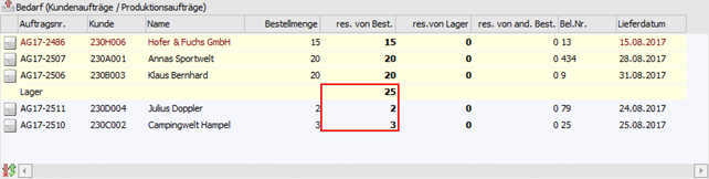 Wird z.B. eine höhere Menge bestellt, als jene, welche automatisch reserviert wurde, so kann die überschüssige Menge auf die übrigen Bedarfszeilen oder dem Lager aufgeteilt werden (siehe Spalte "res. von Best.").