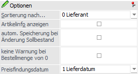 Aus der Auswahlliste kann eine Preisliste ausgewählt werden, welche bei der Lieferantenauswahl ausschließlich berücksichtigt werden soll. Durch die Einstellung "000 - alle Preise berücksichtigen" erfolgt keine Preislisteneinschränkung.