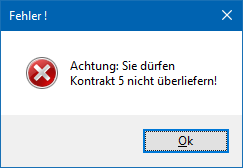 Ist lt. FAKT-Parametern die Übererfüllung von Kontrakten hingegen "erlaubt mit Warnung", dann erfolgt nach Anwählen der Menge in der jeweiligen Artikelzeile eine Warnung, dass der Kontrakt überliefert wird.