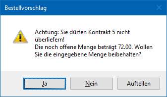 Im Feld "Menge" kann diese dann entsprechend geändert werden. Ist die angegebene Menge weiterhin über der noch offenen Kontraktmenge, so erfolgt eine weitere Meldung: