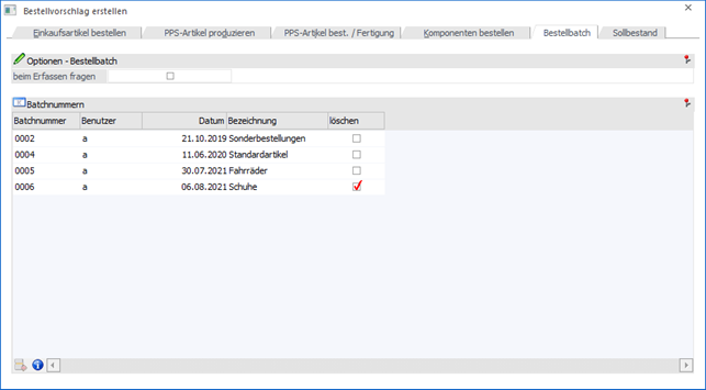 Wird die Option "löschen" aktiviert (Standard-Einstellung), so wird nach dem Erstellen der Lieferantenbelege der Batch gelöscht. Voraussetzung dafür ist, dass der Batch keine Artikelzeilen mehr enthält. Wenn diese Option nicht aktiviert wird, so wird der Batch beim Erstellen von Lieferantenbelegen nicht gelöscht und kann/muss über den Menüpunkt Bestellvorschlag initialisieren entfernt werden.