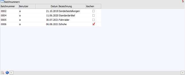 In diesem Register werden bestehende Batches mit Nummer, Benutzer und Datum angezeigt. Hier können weitere, eigene Batches erstellt bzw. bei den bestehenden Batches eine Bezeichnung vergeben werden.