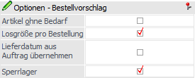 Wenn die Checkbox deaktiviert wird, so wird bei der Berechnung der Bestellmenge für eine Bestell-"Einzelzeile" der resultierende Lagerstand aus den vorigen Bestellzeilen in diesem Bestellvorschlag laufend mitberücksichtigt. Dadurch kann vermieden werden, dass die hinterlegte EK-Losgröße bei jeder einzelnen Bestellzeile für die Mengenberechnung angewendet wird. Dies kann dazu führen, dass eine eigene Bestellzeile (Typ "Einzelzeile") pro Auftrag nicht mehr erzeugt wird, da aus den vorigen Bestellzeilen in dem Bestellvorschlag noch genügend Menge auf Lager vorhanden ist.