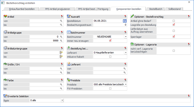 An dieser Stelle kann nach Produktionsartikeln und deren benötigten Komponenten selektiert werden. Sollte eine Selektion hinterlegt werden, so werden nur die Komponenten für diese Produktionsartikel bestellt, die Auffüllung auf Sollbestand findet hingegen nicht statt.