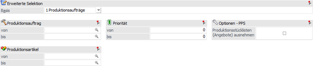 An dieser Stelle können weitere Selektionsfelder aktiviert werden, wobei die Selektionsbasis "1 - Produktionsaufträge" oder "2 - Fertigungsstücklisten" sein können.