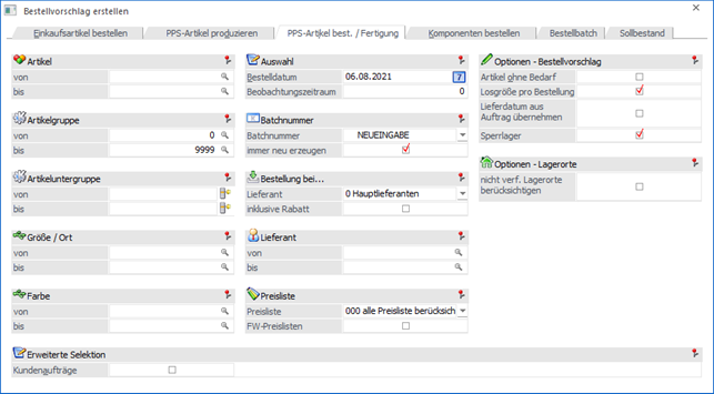 In diesen Feldern kann nach den Artikelgruppen eingeschränkt werden, welche in dem Bestellvorschlag berücksichtigt werden sollen.