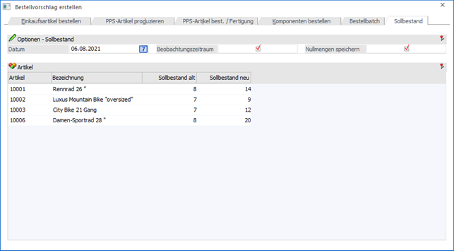 Nach Anwahl des Buttons "Sollbestand berechnen" wird die Tabelle mit den berechneten Artikeln gefüllt.