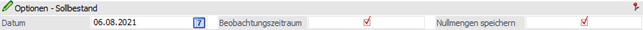Dieses Feld wird mit dem Bestelldatum vorbelegt (das Bestelldatum ist standardmäßig mit dem "Auswertedatum" besetzt). Der Sollbestand wird anhand dieses Datums (bzw. auch inklusive der Anzahl der Tage im Beobachtungszeitraum) berechnet.
