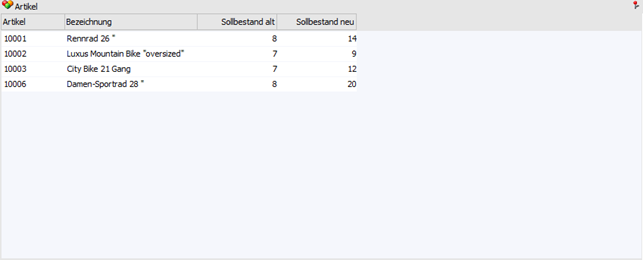 In diesen Spalten werden die jeweiligen Artikel und Artikelbezeichnung mit dem neu berechneten Sollbestand angezeigt.
