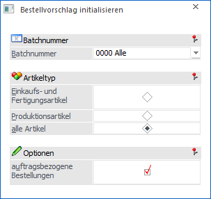 Wird die Batchnummer "0000 - Alle" gewählt, so kann mittels Checkbox entschieden werden, ob auch die auftragsbezogenen Bestellungen initialisiert werden sollen.
