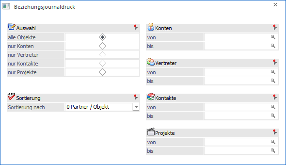 Über die Auswahl kann bestimmt werden, für welche Objekte das Beziehungsjournal gedruckt werden soll: