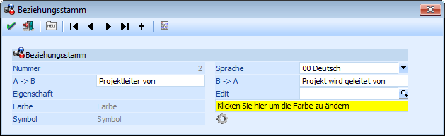 An dieser Stelle kann über die Matchcodefunktion ("Lupen"-Symbol oder Taste F9) eine Eigenschaft gewählt werden, welche der Beziehung zugeordnet werden soll.