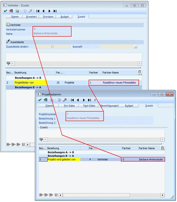 Beim Vertreter ist dann automatisch die Beziehung A -> B eingetragen, wo dann als "Partner" das Projekt ausgewiesen wird.