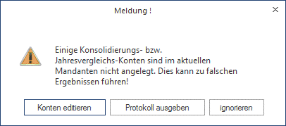 Werden die Warnhinweise auf eine falsche BKZ-Zuordnung, bzw. fehlende Konsolidierungskonten ignoriert erfolgt zwar eine Ausgabe der Bilanz, es ist aber nicht sichergestellt, dass die Zuordnungen in der von ihnen gewünschten Weise durchgehend erfolgt. D. h. der Saldo eines Kontos wird zwar in der Gesamtsumme berücksichtigt, es kann aber sein, das die Zuordnung in einer anderen BKZ-Summe erfolgt als dies notwendig ist.
