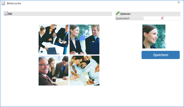 Nach der Auswahl einer Grafik (siehe Button "Bildersuche - WinLine" bzw. "Bildersuche - Datenträger") kann diese zugeschnitten werden, wobei der Bereich per Raster definiert wird. Die Vorschau ist jederzeit im rechten Bereich ersichtlich.