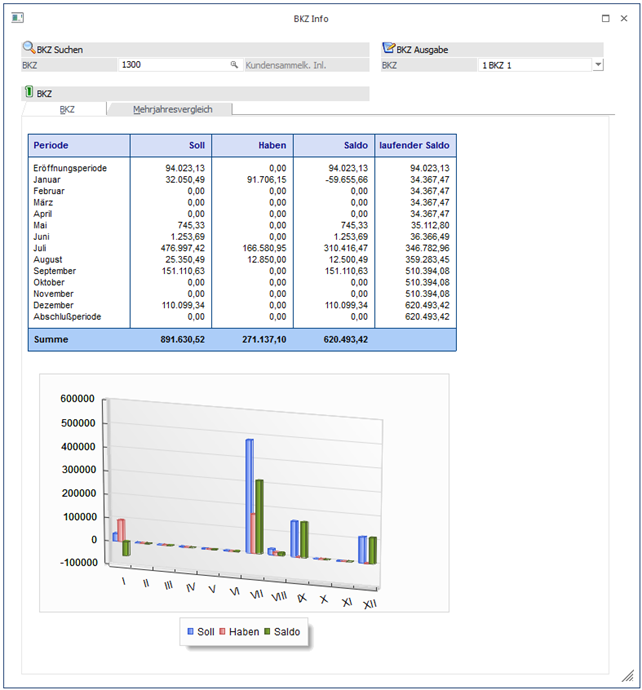 In diesem Fenster werden die Umsätze einer BKZ sowohl in Zahlen als auch in einer Grafik dargestellt. Dabei werden die gebuchten Daten natürlich in den Perioden angedruckt, die lt. Buchungsdatum gültig sind. D.h. verläuft die Periode Januar vom 01. Januar bis 05. Februar, wird ein am 03. Februar gebuchter Wert noch in der Periode Januar angezeigt.