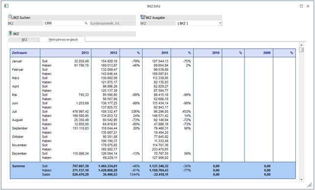 Durch Anwahl des Registers "Mehrjahresvergleich" können neben den laufenden Umsatzzahlen auch die Umsatzzahlen der letzten (max. 5) Jahre angezeigt werden.
